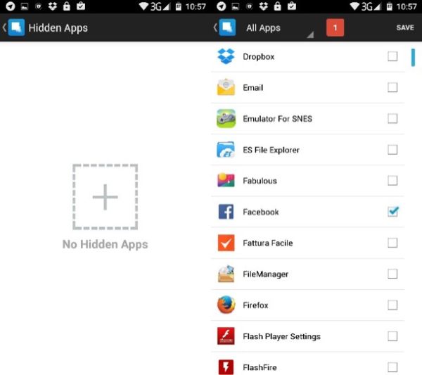 Per utilizzarla, scaricala dal Play Store e avviala. Dopodiché pigia sul pulsante Later, fai “tap” sul simbolo + collocato al centro dello schermo, metti il segno di spunta accanto alle icone delle app che vuoi nascondere e pigia sul bottone Save collocato in alto a destra per salvare i cambiamenti. Quando richiesto, pigia sul pulsante Concedi per consentire ad AppHider di ottenere i permessi di root.