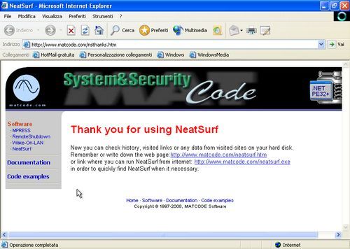 Appena finito di navigare sulla grande rete, chiudi normalmente Internet Explorer. Verrà mostrato un messaggio di ringraziamento da parte di NeatSurf e, come potrai immediatamente constatare, elementi quali cronologia e cookie saranno stati del tutto "dimenticati" dal browser.