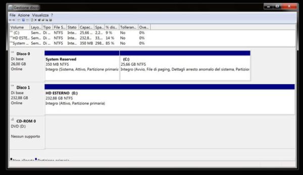 Se non hai mai modificato le partizioni dell'hard disk, l'utility disco di Windows dovrebbe presentarsi in questo modo.