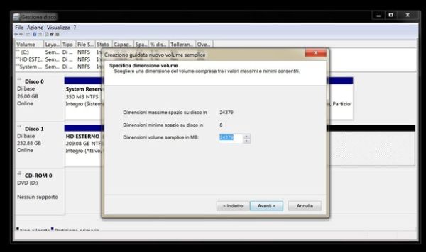 Nella finestra che si apre, clicca sul pulsante Avanti e segui la procedura guidata per la creazione della nuova partizione sull'hard disk. Specifica quindi le dimensioni del volume semplice (cioè la quantità di spazio da riservare alla partizione), la lettera da assegnare all'unità (la lettera da visualizzare in Risorse del computer) e il file system da usare per la sua formattazione, clicca su Avanti e Fine e attendi che vengano applicati tutti i cambiamenti.