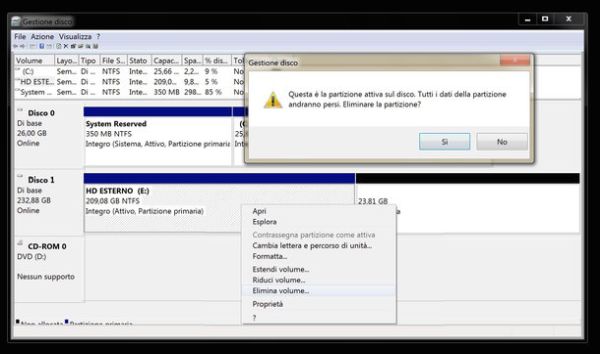 Per eliminare una partizione in Windows 7, basta selezionare il suo grafico con il tasto destro del mouse, scegliere l'opzione Elimina volume dal menu che compare e confermare l'operazione cliccando su Sì.