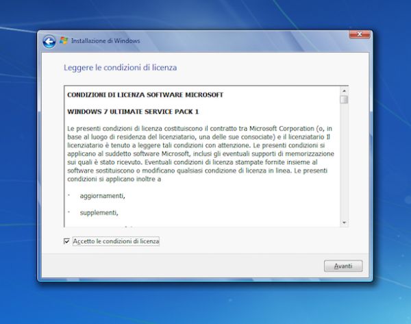 Nella finestra che a questo punto ti viene mostrata, seleziona l'edizione del sistema che vuoi reinstallare (es. Windows 7 Home Ultimate) e poi clicca sul pulsante Avanti. Accetta quindi le condizioni di utilizzo del sistema mettendo il segno di spunta accanto alla voce Accetto le condizioni di licenza e clicca ancora una volta su Avanti per proseguire con l'installazione di Windows.
