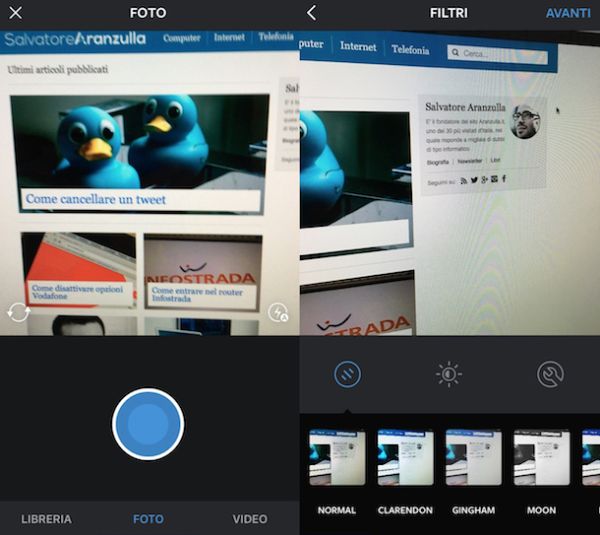 Quando sei soddisfatto del risultato ottenuto puoi procedere andando a postare su Instagram la tua foto pigiando sulla voce Avanti che si trova in alto a destra.
