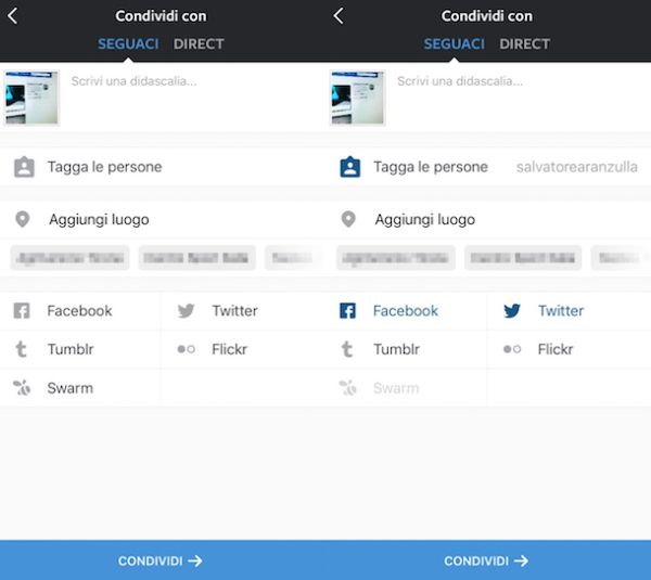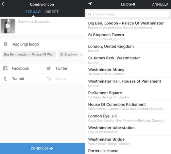 Nella schermata che si apre digita la didascalia con cui vuoi accompagnare l'immagine nell'apposito campo di testo, seleziona i servizi di social networking sui quali postare la foto oltre ad Instagram (Facebook, Twitter, Tumblr, Flickr e Swarm) e indica eventualmente il luogo dello scatto pigiando sulla voce Aggiungi un luogo.