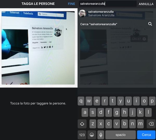Se nella tua foto sono presenti amici o conoscenti anch'essi in possesso di un account su Instagram puoi inoltre taggare altri utenti nella tua foto in maniera analoga a quanto è possibile fare su Facebook e su altri social network. Per taggare persone nelle tue foto su Instagram pigia sulla voce Tagga le persone, tocca poi nel punto dello scatto in cui intendi effettuare il tag (se sono presenti i volti delle persone che intendi taggare ti suggerisco di selezionare questi), digita il nome di colui o colei che vuoi taggare nel campo Cerca una persona e poi pigia sul suggerimento che ti viene mostrato. Dopo aver eseguito questi passaggi il tag apparirà sul tuo scatto e potrai eventualmente collocarlo in una posizione differente da quella attuale semplicemente pigiandoci sopra e trascinandolo oppure, in caso di ripensamenti, potrai rimuoverlo pigiandoci sopra e facendo poi tap sulla x che comparirà al lato. Dopo aver aggiunto il tag o i tag e dopo aver apportato tutte le modifiche desiderate pigia sulla voce Fine che risulta collocata in alto a destra della schermata che ti viene mostrata.