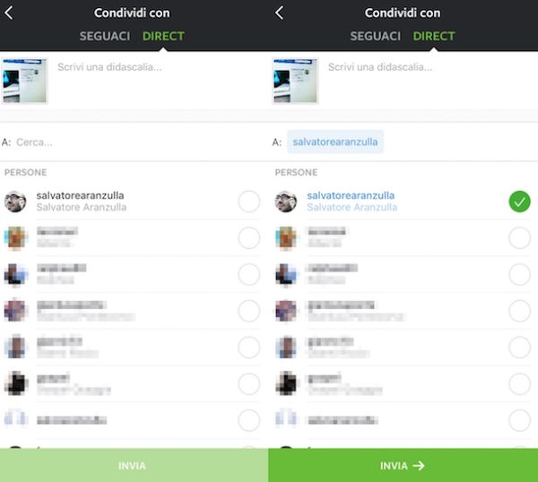 In alternativa, anziché postare su Instagram condividendo i tuoi scatti con tutti gli altri utenti puoi anche sfruttare la funzione Direct accessibile dalla schermata mediante cui effettuare la condivisione delle foto. Tale funzione ti permette di condividere una o più foto con un singolo utente di Instagram in forma privata, in maniera per certi versi simile a quando si utilizza WhatsApp o altre app per la messaggistica istantanea.