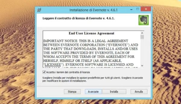 Accetta quindi le condizioni di utilizzo del programma, mettendo il segno di spunta accanto alla voce Accetto i termini del contratto di licenza, e fai click prima su Installa e poi su Termina per completare il processo d'installazione di Evernote.