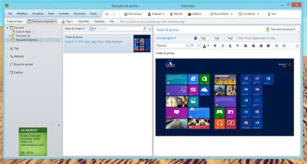 Le note salvate su Evernote vengono suddivise in taccuini e tag (etichette che puoi assegnare alle note per suddividerle ulteriormente in argomenti e tematiche). Nella finestra principale del programma trovi quindi una barra laterale con l'elenco dei taccuini e dei tag presenti sul tuo account, mentre al centro della schermata ci sono le note vere e proprie.