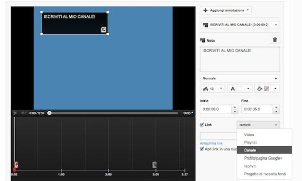 Se non sai come aggiungere delle note ai tuoi video, non devi far altro che accedere alla loro pagina e cliccare sull'icona del fumetto collocata immediatamente sotto il player di YouTube. Nella pagina che si apre, seleziona il punto del filmato in cui far comparire l'annotazione, clicca sul pulsante Aggiungi annotazione (sulla destra) e seleziona la voce Nota dal menu che compare. Digita infine il testo che vuoi far comparire nella nota (es. ISCRIVITI AL MIO CANALE), metti il segno di spunta accanto alla voce Link e seleziona Canale o Iscriviti dal menu a tendina posizionato lì di fianco a seconda se vuoi creare un link al canale o direttamente al pulsante di iscrizione a quest'ultimo. Maggiori info nella mia guida su come editare video su YouTube.