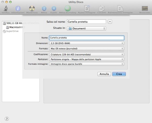 Digita quindi il nome che vuoi assegnare all'immagine disco da creare nei campi Salva col nome e Nome, scegli le dimensioni massime che deve raggiungere l'archivio dal menu a tendina Dimensioni e clicca sul pulsante Crea per digitare la password con cui proteggere l'immagine disco. Prima di cliccare sul pulsante OK ed avviare la creazione della tua "cartella" protetta, rimuovi il segno di spunta dalla voce Memorizza la password nel portachiavi, in questo modo eviterai il salvataggio della parola chiave da parte di OS X.