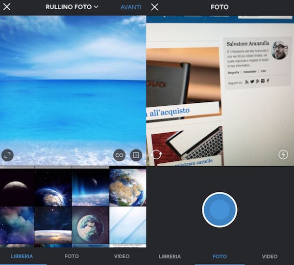 Ora che hai finalmente avviato l'app e che hai eseguito l'accesso al servizio sei pronto a passare all'azione vera e propria e, di conseguenza, a cominciare a pubblicare foto su Instagram. Procedi quindi andando a pigiare sul pulsante di colore blu e raffigurante una macchina fotografica che trovi nella parte in basso al centro della schermata visualizzata dopodiché scegli se andare ad agire su eventuali foto già presenti nella libreria del tuo telefono pigiando su Libreria e selezionando un'immagine o se scattarne di nuove semplicemente facendo tap su Foto e scattando una foto così come di consueto.