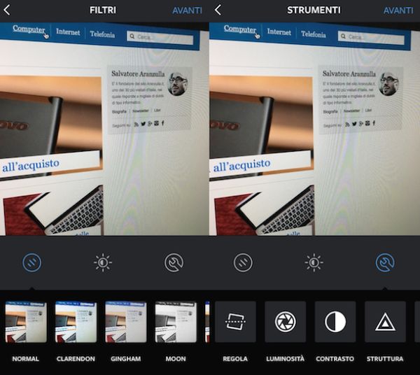 Una volta ottenuto un risultato soddisfacente fai tap sulla voce Avanti collocata nella parte in alto a destra della schermata visualizzata per avanzare nella procedura mediante cui pubblicare foto su Instagram.