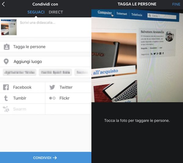 Nella schermata che adesso visualizzi assicurati che sia selezionata la voce Seguaci dal menu collocato in alto dopodiché digita la didascalia con cui vuoi accompagnare la foto nell'apposito campo di testo Scrivi una didascalia..., seleziona i servizi di social networking sui quali postare la foto oltre ad Instagram (attualmente puoi scegliere tra Facebook, Twitter, Tumblr, Flickr e Swarm) e indica il luogo dello scatto pigiando sulla voce Aggiungi un luogo o facendo direttamente tap su uno dei suggerimenti disponibili.