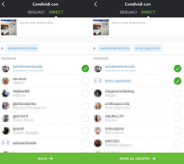Successivamente, fai tap sul pulsante di colore verde con su scritto Invia o Invia al gruppo (la voce varia a seconda del numero di utenti che hai selezionato per l'invio dell'immagine) a fondo schermo. Fatto ciò, l'utente o gli utenti a cui hai deciso di inviare la tua foto in via privata riceveranno una notifica sul proprio smartphone e potranno subito visualizzare quanto da te condiviso.