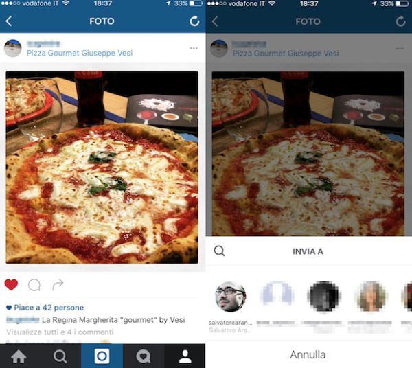 Ora che visualizzi l'ingrandimento della foto precedentemente selezionata pigia sul pulsante a forma di freccia presente sotto la stessa, scegli il nome dell'utente Instagram con cui condividere in via privata lo scatto pigiando su uno dei suggerimenti che ti vengono mostrati oppure cerca il nickname di tuo interesse facendo tap su Invia a e digitandolo nel campo di ricerca apparso sul display.