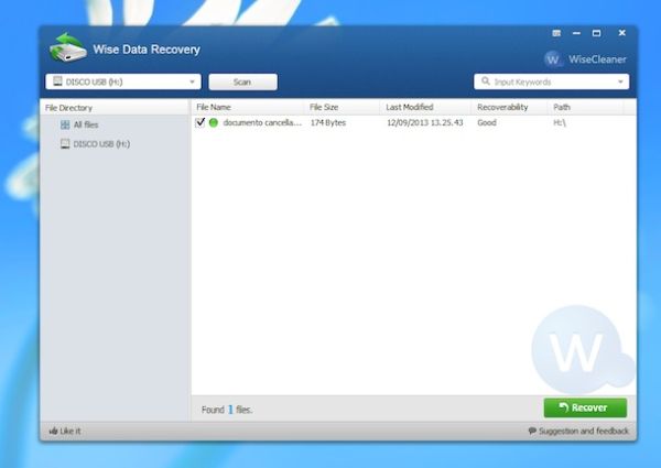 Wise Data Recovery è un programma gratuito per Windows che permette di recuperare i file cancellati da hard disk, dischi esterni e chiavette USB in maniera facile e veloce (ammesso che lo spazio occupato precedentemente dai file cancellati non sia stato riscritto). Supporta documenti di Office, foto, video e tanti altri tipi di file. Vediamo subito come recuperare file cancellati da hard disk esterno utilizzandolo.