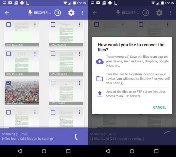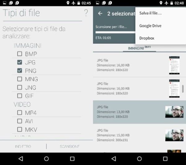 Successivamente, scegli l'opzione Restore files, fai "tap" sull'unità dalla quale intendi recuperare le immagini (es. Storage interno) e vai su Scansione profonda. Metti quindi il segno di spunta accanto alla voce JPG e/o PNG e premi su Scansione per avviare la ricerca dei file recuperabili. A scansione completata, seleziona le miniature delle foto da recuperare, pigia sul bottone menu collocato in alto a destra (l'icona con i tre puntini) e seleziona la voce Salva il file dal menu che compare per completare l'operazione.