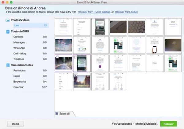 Qualora non riuscissi a trovare la foto che t'interessa nella memoria dell'iPhone, torna nella schermata iniziale di EaseUS MobiSaver e prova ad avviare una scansione dei backup di iTunes scegliendo l'opzione Recover from iTunes backup (per controllare i backup salvati in locale) oppure l'opzione Recover from iCloud backup (per controllare i backup salvati online).