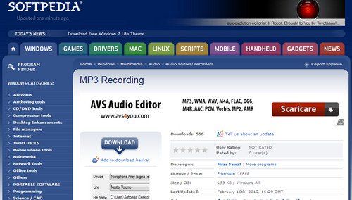Collegati a questa pagina del sito Internet Softpedia e fai click sul pulsante Download. Nella pagina che si apre, clicca sulla voce Softpedia Secure Download (US) per scaricare il programma sul tuo PC. A scaricamento ultimato apri, facendo doppio click su di esso, l'archivio appena scaricato (mp3recording_demo.zip), estraine il contenuto in una cartella qualsiasi ed avvia il programma Record.exe per far partire Record.