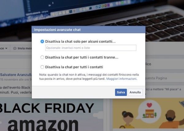 In alternativa, puoi scegliere di disattivare la chat per tutti i contatti tranne alcuni amici o liste di amici apponendo un segno di spunta in corrispondenza dell'opzione Disattiva la chat per tutti i contatti tranne... e digitando i nomi delle persone o delle liste interessante.