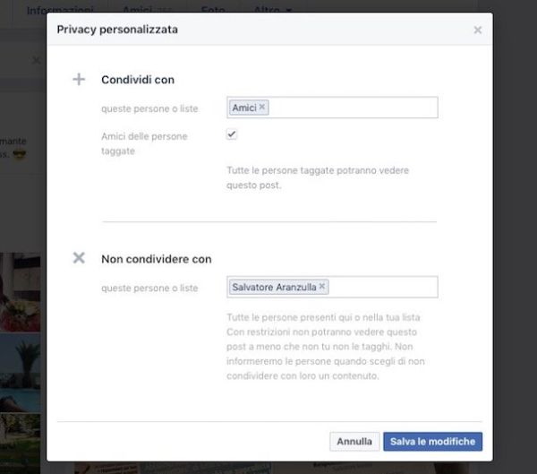 Se invece vuoi limitare la visione di un messaggio, una foto o un video che hai già caricato sul tuo profilo, devi ripetere la stessa operazione richiamando il menu Personalizzata dall'icona con l'omino o il mappamondo che si trova in cima al riquadro del post.