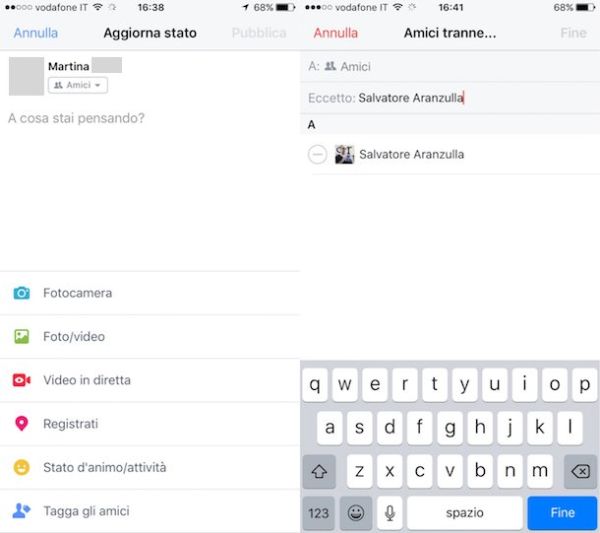 In seguito, digita il nome dell'amico o della lista di amici a cui rendere invisibile il post nel campo Eccetto:, pigia sulla freccia in alto a sinistra per salvare i cambiamenti e procedi normalmente alla pubblicazione del tuo messaggio o dei tuoi contenuti multimediali.