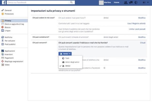 In seguito, seleziona la voce Privacy, individua le voci Chi può cercarti usando l'indirizzo email che hai fornito? e Chi può cercarti usando il numero di telefono che hai fornito?, pigiaci sopra e, in tutti e due i casi, scegli l'opzione Amici.