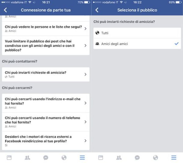 Per quanto concerne invece la possibilità di impedire alle persone che non conosci di inviarti richieste di amicizia, trova l'opzione Chi può inviarti richieste di amicizia?, pigiaci sopra e fai tap su Amici degli amici.