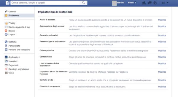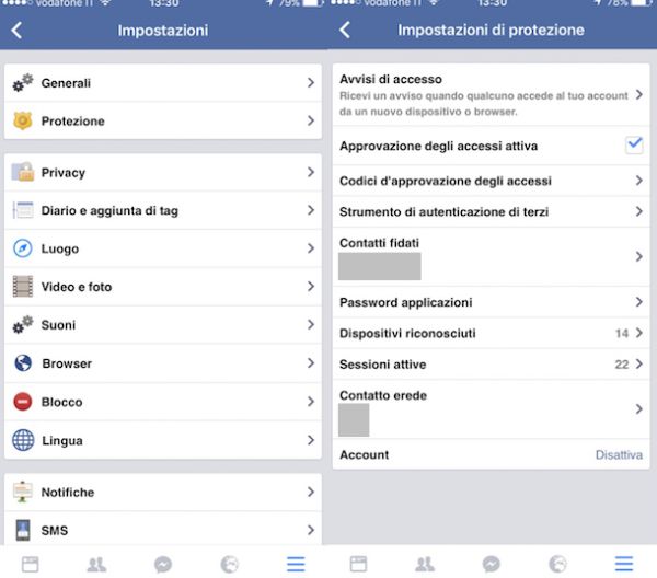 Se invece preferisci agire dal tuo smartphone oppure dal tuo tablet, puoi compiere la stessa operazione vista poc'anzi avviando l'app di Facebook, pigiando sul pulsante con le tre linee e selezionando la voce Collegamenti rapidi alla privacy. Successivamente pigia su Altre impostazioni e fai tap su Protezione dal menu che compare.