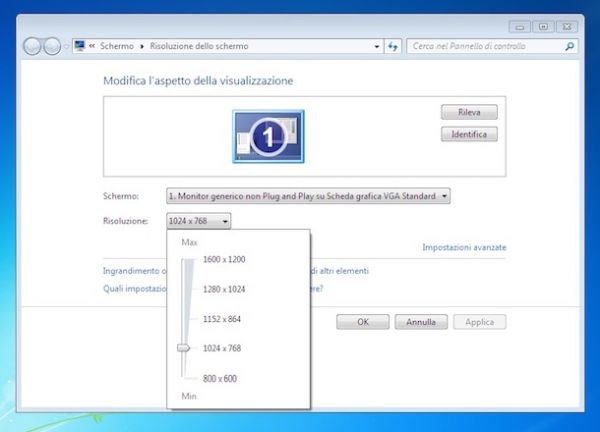 Nella finestra che a questo punto ti verrà mostrata, apri il menu a tendina che trovi in corrispondenza della voce Risoluzione: e seleziona un valore differente rispetto a quello attualmente impostato e che ritieni più consono alle tue esigenze (es. se c'è impostata una risoluzione di 1600 x 900 pixel, prova a selezionare 1280 x 720 pixel). Successivamente clicca prima su Applica e poi su OK per salvare i cambiamenti.