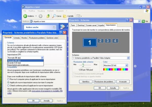 Nella finestra che a questo punto andrà ad aprirsi, recati nella scheda Impostazioni e clicca sul pulsante Avanzate che si trova in basso a destra. Seleziona quindi la voce Impostazioni personalizzate dal menu a tendina Impostazione DPI e scegli da lì la dimensione del testo che vuoi visualizzare su schermo. Per applicare i cambiamenti potrebbe esserti richiesto l'inserimento del disco d'installazione del sistema operativo nel PC.
