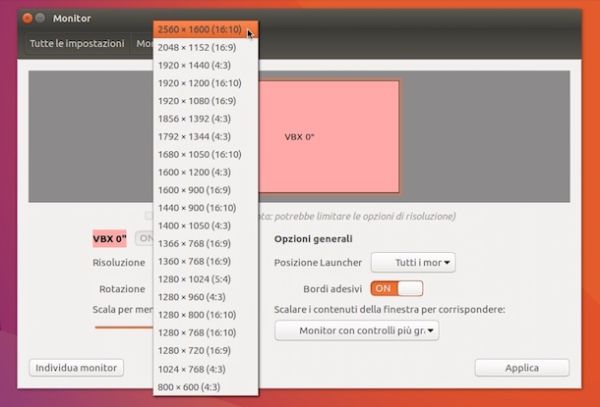 Se sul tuo computer hai installato Ubuntu (una delle più popolari distribuzioni di Linux), puoi ridimensionare lo schermo recandoti in Impostazioni di sistema facendo clic sull'apposita icona annessa alla barra collocata nella parte sinistra dello schermo e cliccando poi su Monitor.