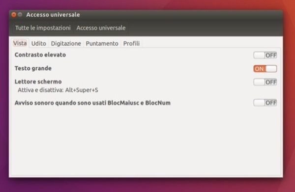 Anche su Ubuntu è possibile ridimensionare lo schermo andando ad agire sulla dimensione dei caratteri. Per fare ciò, recati in Impostazioni di sistema facendo clic sull'apposita icona annessa alla barra collocata nella parte sinistra dello schermo e seleziona la voce Accesso universale dalla finestra che si apre.