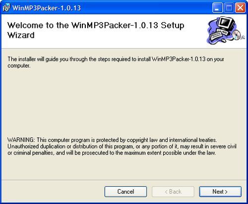 Per scaricare il programma, fai click qui. A scaricamento completato apri, facendo doppio click su di esso, l'archivio appena scaricato (winmp3packer-113.zip) ed estraine il contenuto in una cartella qualsiasi. Avvia quindi il programma WinMP3PackerSetup.msi per far partire il processo d'installazione di MP3 Packer.