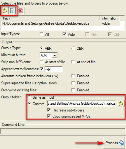 Una volta selezionati tutti i file e tutte le cartelle che intendi processare, non devi far altro che selezionare la cartella in cui salvare gli MP3 compressi, mettendo il segno di spunta accanto alla voce Custom e cliccando sul pulsante raffigurante una cartella che si trova al suo fianco, ed avviare la compressione facendo click sul pulsante Process.