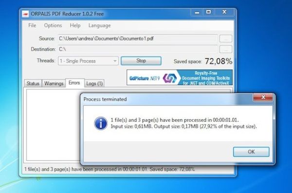 Cominciamo questa rapida guida su come rimpicciolire un file PDF parlando di PDF Reducer, un'applicazione gratuita per Windows che come suggerisce facilmente il nome permette di ridurre il peso dei documenti in formato PDF. È molto facile da utilizzare e dà il meglio di sé con i file contenenti molte immagini o elementi grafici, i documenti composti da solo testo vengono ridotti di pochissimo.
