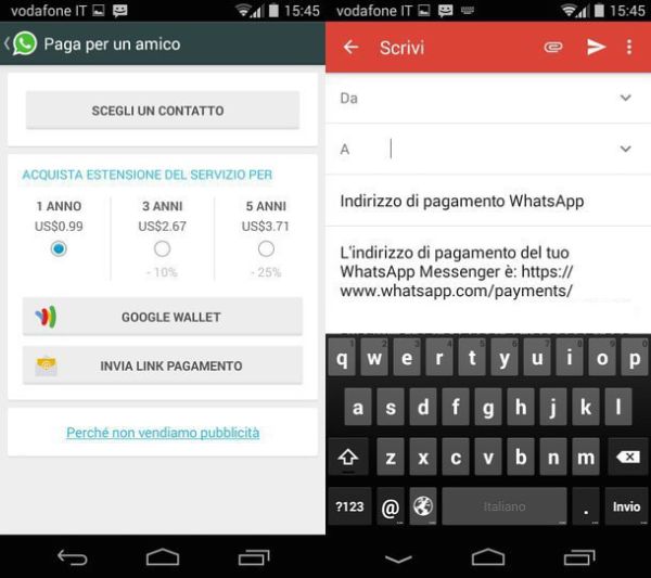 La sottoscrizione a WhatsApp si può pagare in vari modi: con la carta di credito associata al proprio smartphone (quella che si usa per acquistare le app su Google Play, App Store ecc., tanto per intenderci); con un conto PayPal oppure con il credito telefonico (azione attualmente supportata solo da Wind in Italia).