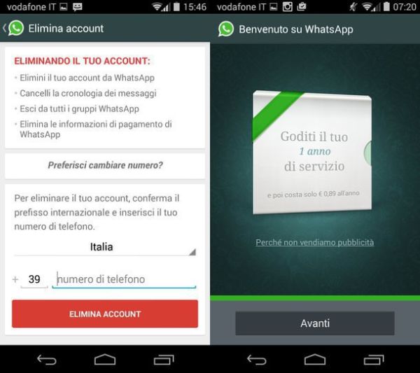 Prima accennavo anche a un metodo per evitare il pagamento di WhatsApp mediante la cancellazione del proprio account. La procedura, come ti dicevo, è molto articolata, presenta varie controindicazioni (in primis la cancellazione di tutte le chat) e non assicura sempre il 100% di riuscita: non vale assolutamente la pena portarla a termine per evitare una spesa di appena 89 centesimi. Ad ogni modo, per puro scopo informativo, adesso te la illustro più in dettaglio.