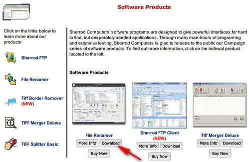 Innanzitutto, collegati sul sito Internet di File Renamer e fai click sulla voce Products che si trova nella parte alta della pagina. Nella pagina che si apre, fai click sul pulsante Download situato sotto la voce File Renamer per scaricare il programma sul tuo PC.