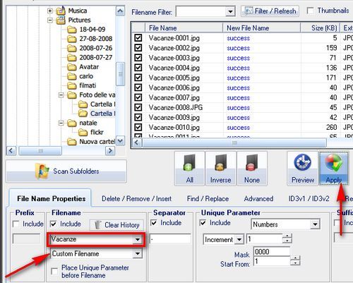 Seleziona quindi la voce Custom Filename dal secondo menu a tendina situato sotto la voce Filename, digita il nome che vuoi assegnare ai tuoi file nel campo Filename (es: Vacanze) e clicca sul pulsante Preview per avere un'anteprima di come verranno rinominati i file. Se sei soddisfatto del risultato, fai click sul pulsante Apply per due volte consecutive per rinominare i file.