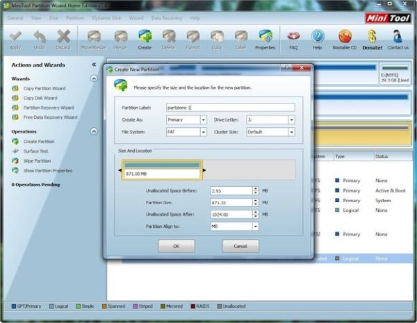 Nella finestra che si apre, imposta FAT o FAT32 nel menu a tendina FIle system, in base ai parametri appena elencati, seleziona la voce Primary dal menu a tendina Create as ed utilizza la barra di regolazione che si trova in basso per selezionare le dimensioni della partizione. Infine, per applicare i cambiamenti, clicca prima su OK, poi su Apply (in alto a sinistra) ed attendi che MiniTool Partition Wizard svolga il suo lavoro.