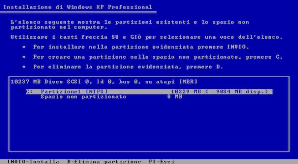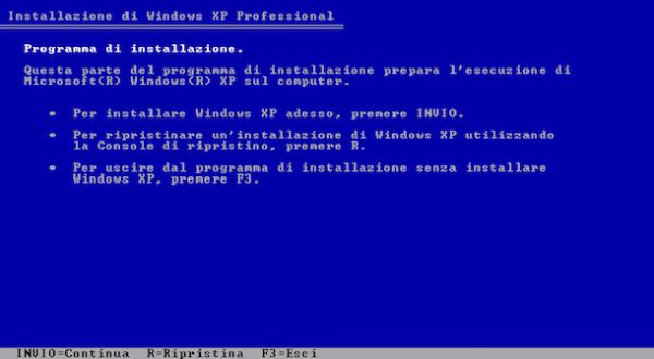Una volta avviata la procedura d'installazione di Windows XP premi il tasto Invio sulla tastiera per dare il via al setup del sistema operativo ed accetta le condizioni d'uso del software pigiando sul tasto F8.