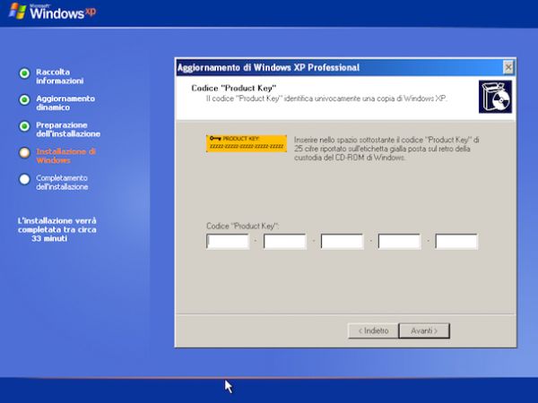 Digita ora il tuo nome ed eventualmente anche il nome della tua organizzazione negli appositi campi di testo dopodiché clicca nuovamente su Avanti per digitare il product key di Windows XP. Il product key è il codice di 25 caratteri alfanumerici necessario per poter eseguire l'attivazione del sistema operativo. Dovresti trovare il product key della copia di Windows XP in tuo possesso dando uno sguardo sul retro o all'interno della confezione di vendita del CD-ROM del sistema operativo oppure su un'apposita etichetta appicciata sul case del tuo computer. Se al momento non hai a portata di mano il product key clicca prima su Avanti e No in modo tale da immetterlo in un secondo momento, al termine dell'installazione di Windows XP.