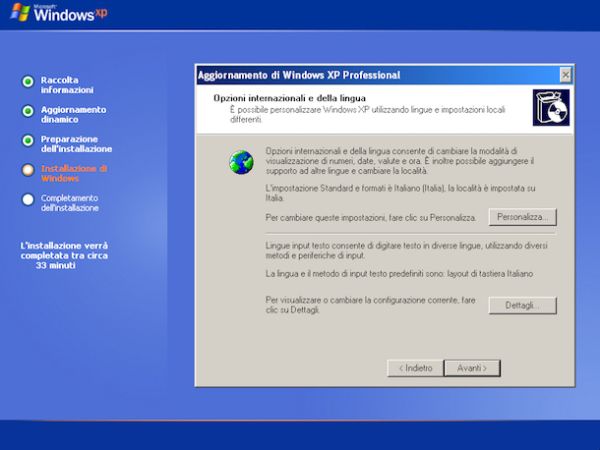 A questo punto dovresti veder comparire sullo schermo la finestra inerente le opzioni internazionali e della lingua. Accertati che il paese e il layout della tastiera siano impostati correttamente e clicca sul pulsante Avanti.