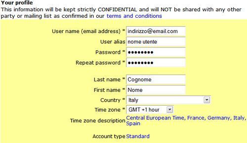 Nella pagina che si apre, compila il modulo inserendo il tuo indirizzo di posta elettronica nel campo User name (email address), il nome utente che vuoi utilizzare su WatchThatPage nel campo User alias, la password che vuoi utilizzare su WatchThatPage nei campi Password e Repeat Password, il tuo cognome nel campo Last name, il tuo nome nel campo First Name e seleziona Italy dal menu a tendina situato accanto alla voce Country.