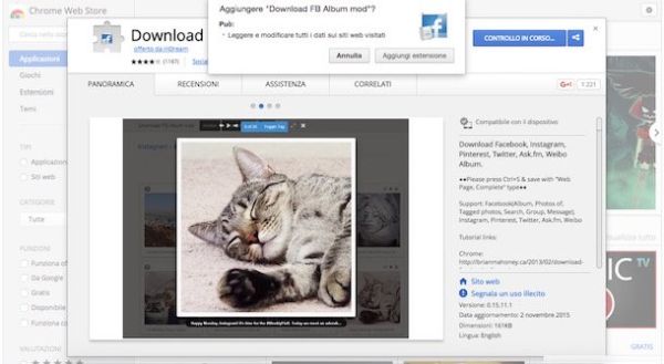 Ti faccio l'esempio di Download FB Album Mod, una delle estensioni più scaricate dal Chrome Web Store per quanto riguarda il download degli album di Facebook, che funziona molto bene ma al momento dell'installazione richiede il permesso di leggere e modificare tutti i dati sui siti Web visitati.