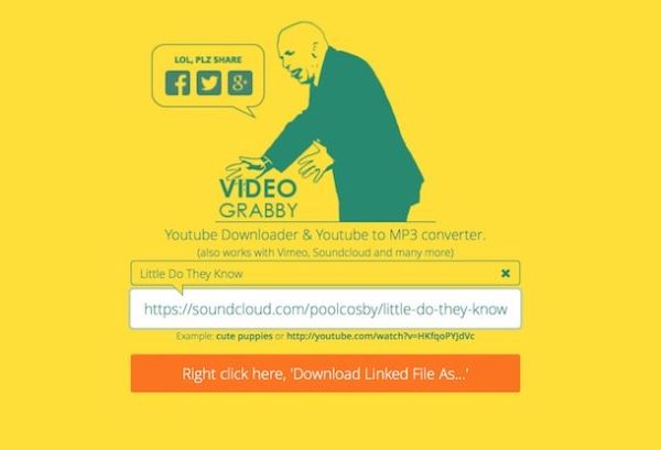 Cominciamo da un paio di soluzioni online. Quella più rapida e semplice da utilizzare è Video Grabby che permette di scaricare le canzoni da SoundCloud sotto forma di file MP3 in due click. Tutto quello che bisogna fare è incollare l'indirizzo del brano nella barra collocata al centro dello schermo, cliccare con il tasto destro del mouse sul pulsante Right click here, "Download linked file as…" e selezionare la voce Salva link con nome dal menu che compare.