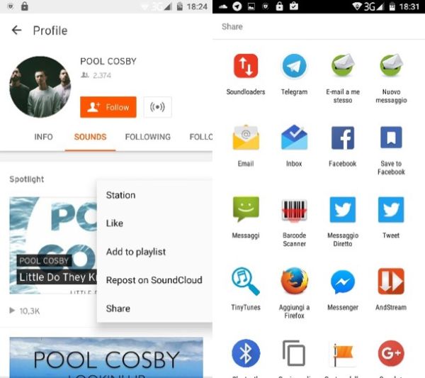 Se utilizzi un terminale Android, puoi provare Soundloaders che è totalmente gratuita e funziona direttamente dal menu di condivisione del telefono (o del tablet). Per utilizzare questa app, non devi far altro che individuare il brano di tuo interesse nell'applicazione ufficiale di SoundCloud (o anche nel browser, usando la versione Web del servizio). Dopodiché devi pigiare sul pulsante (…) che si trova sotto il titolo del brano, devi selezionare l'opzione Share dal menu che si apre e devi pigiare sull'icona di Soundloaders che si trova nelle opzioni di condivisione.