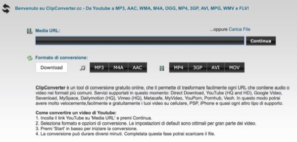 ClipConvert rientra anch'esso nel novero dei migliori servizi Web per scaricare e convertire video da YouTube. Usarlo è semplicissimo. Dopo esserti collegato alla sua pagina principale, incolla l'indirizzo del video di YouTube da scaricare nella barra collocata in alto e clicca sul pulsante Continua.