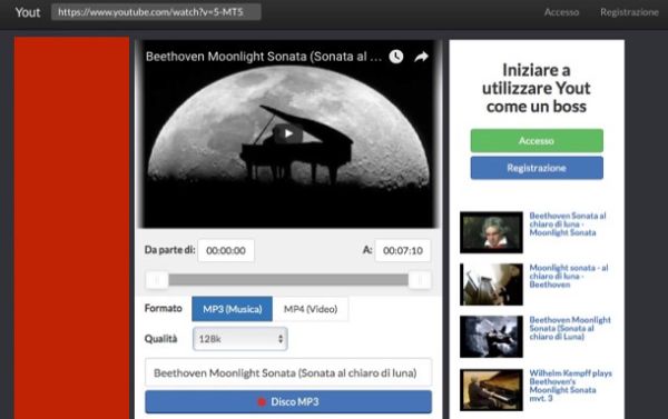 Nella pagina che si apre, seleziona la scheda MP3 (Musica), scegli la qualità del brano da scaricare (es. 128k) dall'apposito menu a tendina e fai click sul pulsante Disco MP3 per avviare il download. Se vuoi, puoi anche “tagliare” il brano da scaricare indicandone i punti di inizio e fine tramite gli indicatori bianchi che si trovano sotto l'anteprima del video. Comodo, vero?